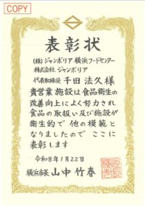 株式会社ジャンボリア横浜フードセンターは、横浜市長より「食品衛生最優秀施設」として表彰されました。